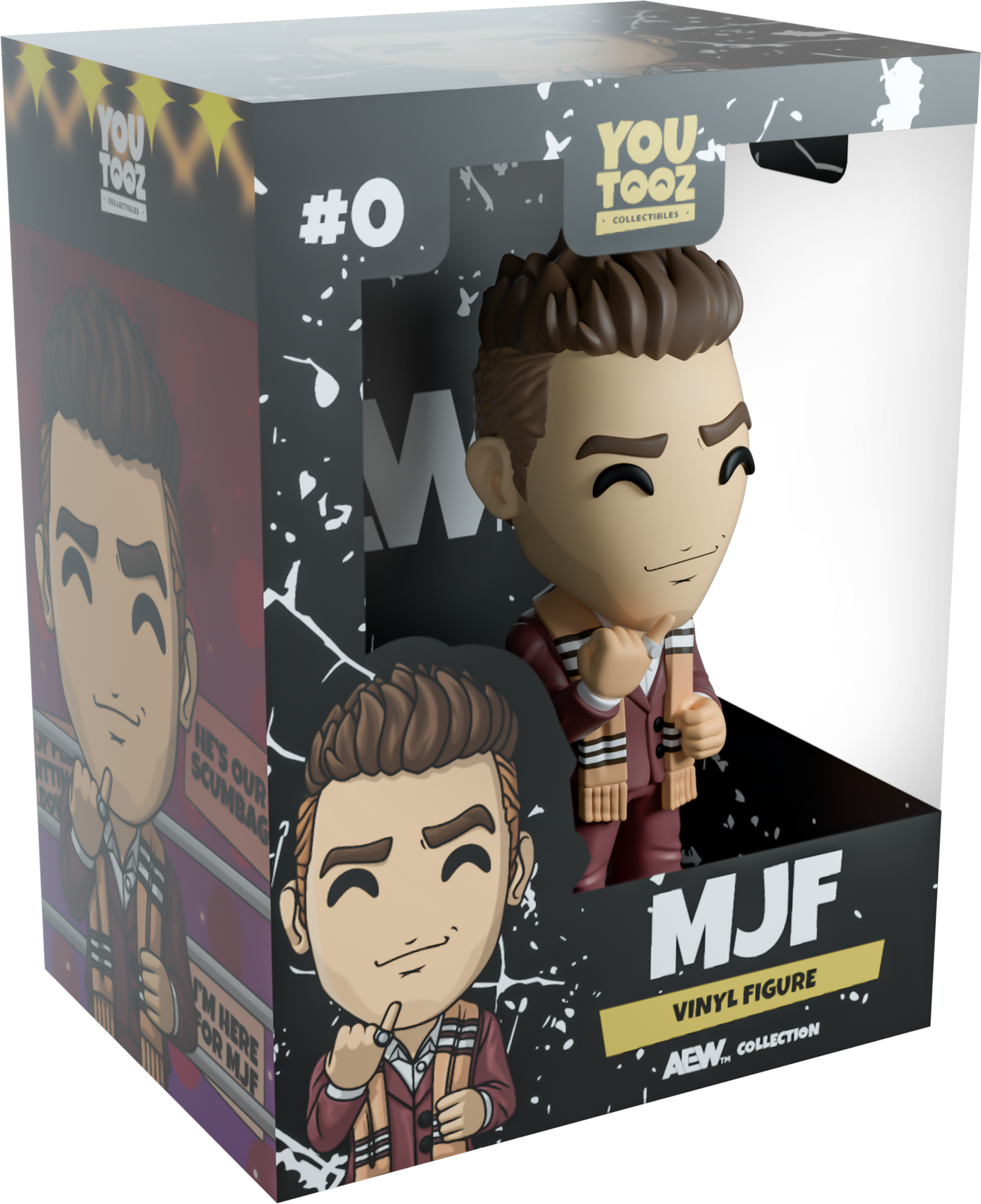 This figure is better than you and you know it! MJF stands ready for a rumble at 4.8 inches tall and is dressed to impress wearing a dark red and well-tailored suit with a long scarf hanging loosely around his neck as he holds onto its side with his left hand. His right hand is raised in a fist with the pinky pointed towards his mouth as his chiseled handsome smirking face is covered a light 5 o'clock shadow and perfectly styled brown hair. His windowed display box has been illustrated to show a wrestling ring lit by spotlights with a bustling audience in the background as he stands on the ropes, soaking in the love from the audience and showing off his perfect body. While the interior has been designed with a sporadic white pattern speckled over a black background which continues onto the protective sleeve as his figure can be seen through the large clear window at its front. This collectible was designed in collaboration with the community member @therealracckun and it ships in a matte, embossed, protective outer sleeve and a custom-sized plastic protector for maximum protection during shipping.