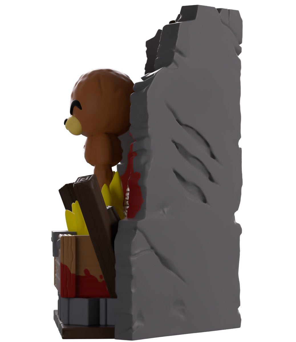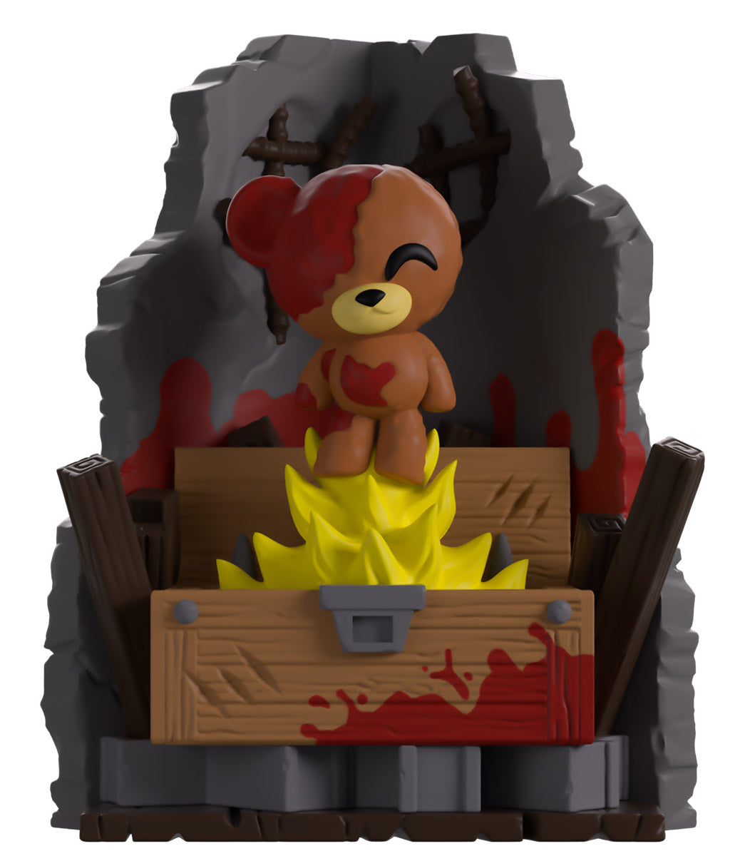 Test your luck and see what your reward is! Just be careful, it may not be as helpful as you need! At 4.9 inches tall and set against a backdrop of cold grey cement with exposed metal rebar, large chunks gouged out, and wooden planks strewn to the sides. The blood-spattered Mystery Box has been flung open as yellow flames emerge from its depths to reveal your ‘prize’, a blood-soaked brown Teddy Bear with a missing ear. But that’s not all as this figure has a 1 in 6 chance for a Chase version which replaces the Teddy with a powerful raygun! So, it's time to track down the box’s next location and test your luck! The exterior of the packaging shows a closed Mystery Box in a dimly lit bloody room, while the interior is pitch black covered in a vibrant red blood spray. The protective sleeve sees a beaten-up wood panelling with red notches marked in it as the figure can be seen through the large clear window at the packaging’s front. This collectible ships in a matte, embossed, protective outer sleeve and a custom-sized plastic protector for maximum protection during shipping.