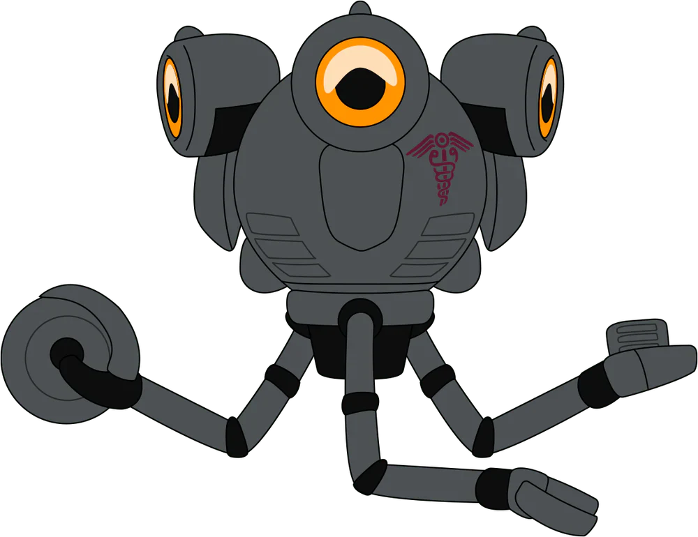 Do you need medical attention? Do you?! No? Well you’re getting it anyway! Floating in at 9 inches tall with a trio of glowing orange eyes looking out from atop a ground grey body of metal panels and vents, three long arms that end in the most sophisticated ‘surgical instruments’ extend outwards at the ready to fix you up to max health! This plush is packed to the seams with 100% PP cotton and is made of the softest minky material, absolutely perfect for cuddling or replacing that lost limb of yours.