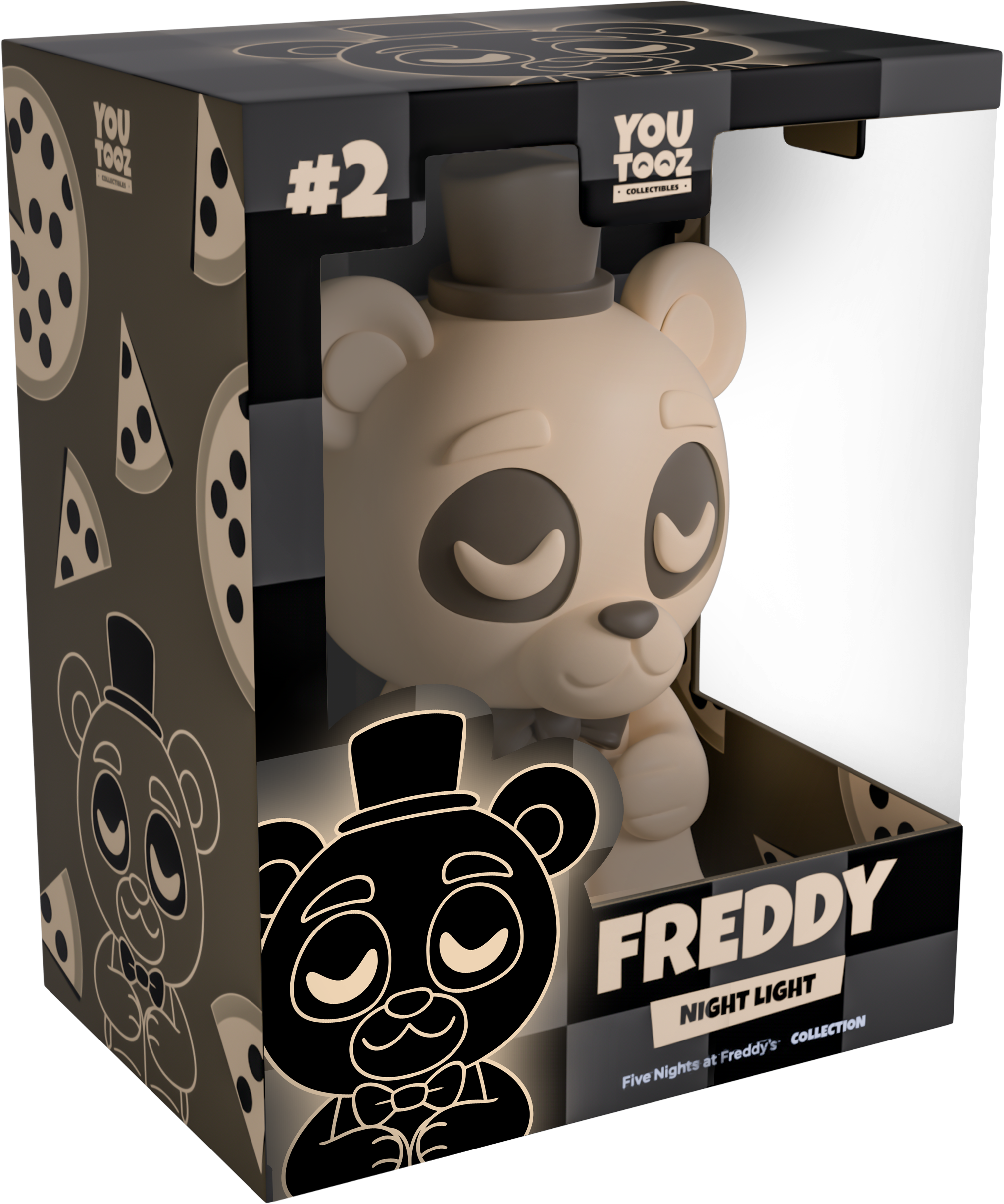 Freddy’s here to make sure every night feels as cozy a bear hug with his debut as a Youtooz night light! Sculpted to perfection by our Youtooz engineers to capture his adorable essence perfectly, he holds onto his knees which are raised up to his chest as a calming smile crosses his light brown face above a black bow tie that matches the small top hat sitting on his round noggin. This night light is 6.8 inches tall and perfect for sitting perched on your bedside table, desk, or anywhere that needs extra light! So just slap in 2 x AAA batteries, flip the switch and you’re ready to watch him illuminate with a spectacular glow that will make sure you feel safe every night!