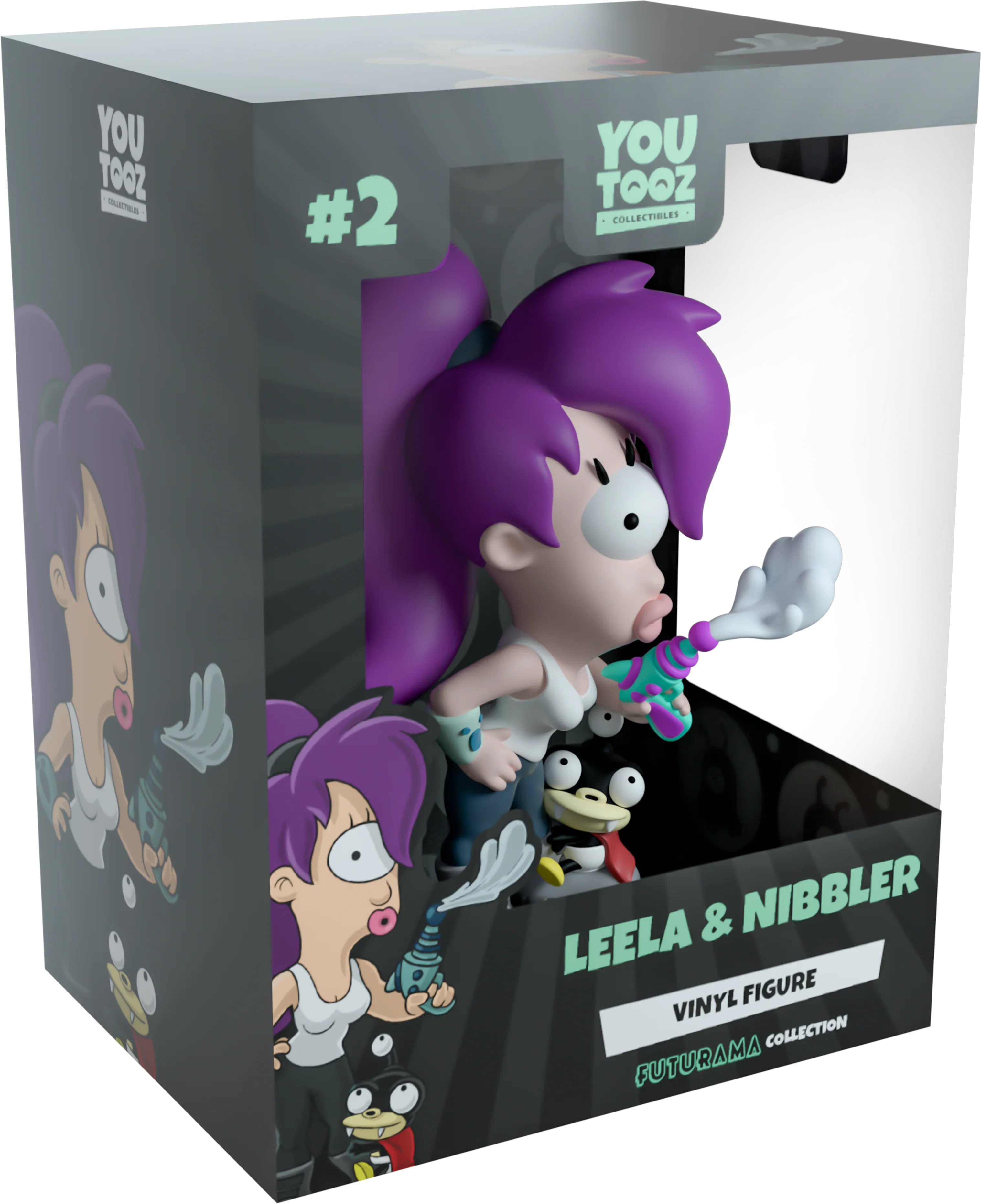 Leela & Nibbler have steered the Planet Express into Youtooz for an urgent delivery, their vinyl debut! Blowing off the smoke from a recently fired ray gun and glancing to the side with her large singular eyeball, she stands at 4.5 inches tall with a thick purple fringe falling down her face as the rest is pulled back into a high ponytail. Dressed in a simple white singlet, tight blue pants and chunky grey boots, around her right arm is the ever useful LoJack-a-mater while gripped to her left leg is the adorable Nibbler who stares up lovingly with his three eyes, wearing a bright red cape and white diaper. The exterior of their packaging sees a vibrant set colorful of pop-art squares showcasing the cast of the show, while the interior is a repeating circle pattern of black and grey brain slugs as light impact lines streak their way over the black protective sleeve, perfectly showing off their figures through the large clear display window at its front. This collectible ships in a matte, embossed, protective outer sleeve and a custom-sized plastic protector for maximum protection during shipping.