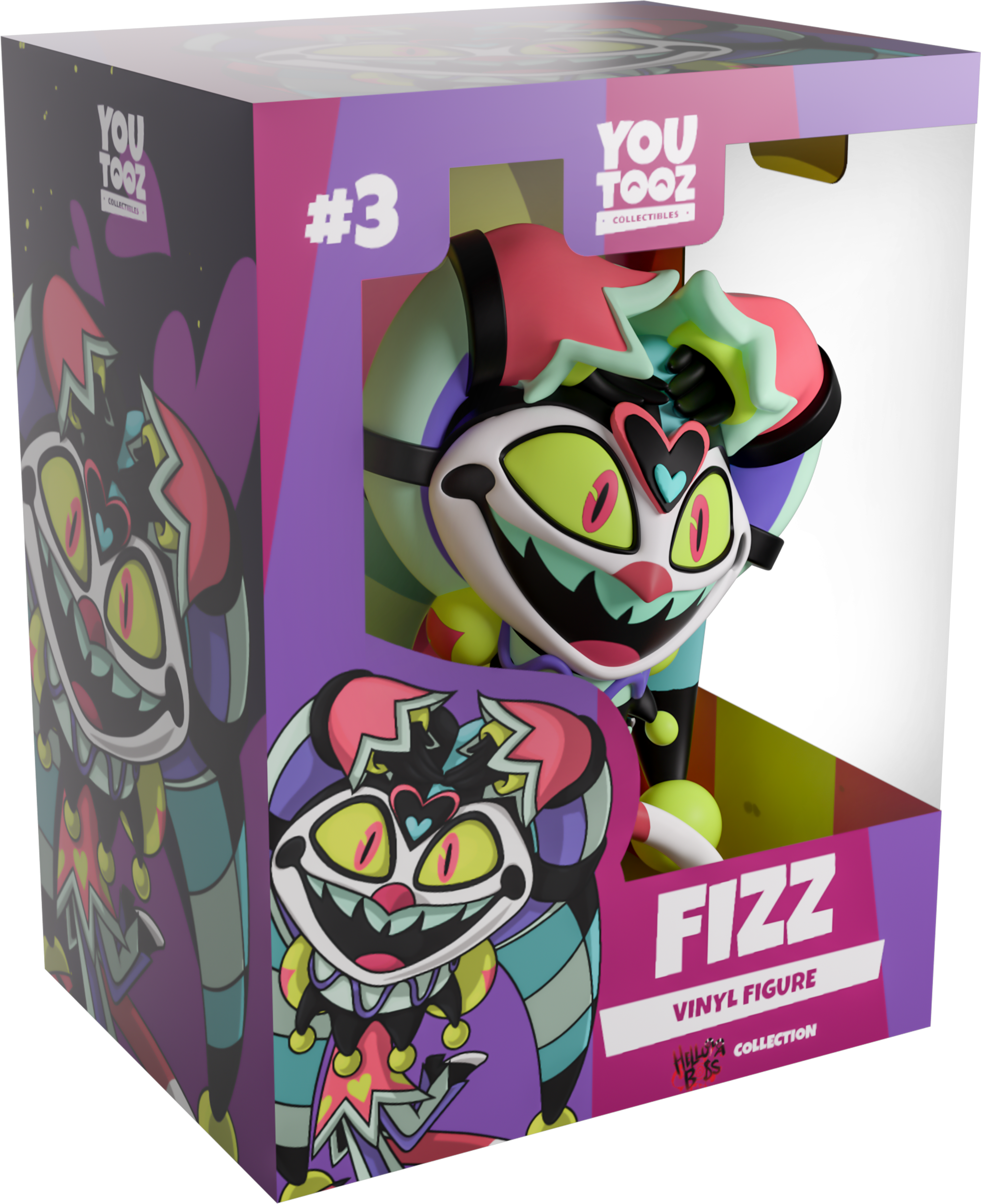 Time for a performance so good it may very well be our last with Fizz’s grand entrance into Youtooz! With arms curling around a manically smiling face that has glowing green eyes and a heart on the forehead, two thick striped points of his jester hat fall down with a pair of balls resting on the ground as he stands at 4.8 inches tall with a leg kicked up behind him. Dressed in an outfit of vibrant purples, pinks, greens and yellows, bells hang from the black points of his collar as hearts line the waist of his top above striped pants and a long pointed tail wraps around his front. The exterior of their packaging sees a bright purple silhouette against a dark background, while the interior surrounds them in pink and yellow stripes and is reminiscent of dirty wallpaper. The protective sleeve is then patterned with diagonal pink and black stripes and printed with the ‘Helluva Boss’ logo as their figure can be seen through the large clear display window at its front. This collectible ships in a matte, embossed, protective outer sleeve and a custom-sized plastic protector for maximum protection during shipping.