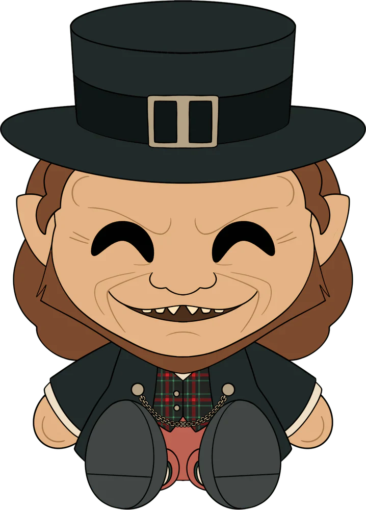 This Leprechaun has snuck into Youtooz in search of his missing pot of gold, oh and his Plush debut of course! Sitting at 9 inches tall with a sneering smile stretching across his wrinkled face to reveal a small row of sharp teeth, small pointed ears stick through his shoulder-length brown hair as a round black hat with a wide brim sits on the top of his head and has a buckle at its front. Dressed in a black blazer with a chain connecting each side over a tartan vest, he wears peach-colored shorts and black shoes. This plush is packed to the seams with 100% PP cotton and is made of felt, normal and sublimated minky and chain materials, absolutely perfect for cuddling and causing mischief with!