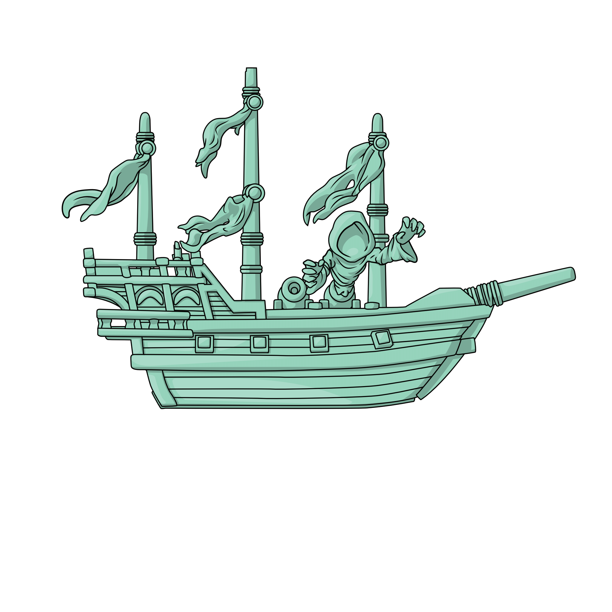 The ghost ship sails in at 3.6 inches, coated with glow in the dark PVC to make the figure stand out during the night. The ship strikes an attack as they catapult one of their ghosts through their cannons. The exterior of this double-walled window box shows a battle at sea through an all blue colorway. The interior is an all black background with a light teal skull silhouette fading through. The protective sleeve shows a Ghost ship at sea with a few handful of ghosts flying alongside it. This collectible ships in a matte, embossed, protective outer sleeve and a custom sized plastic protector for maximum protection during shipping.