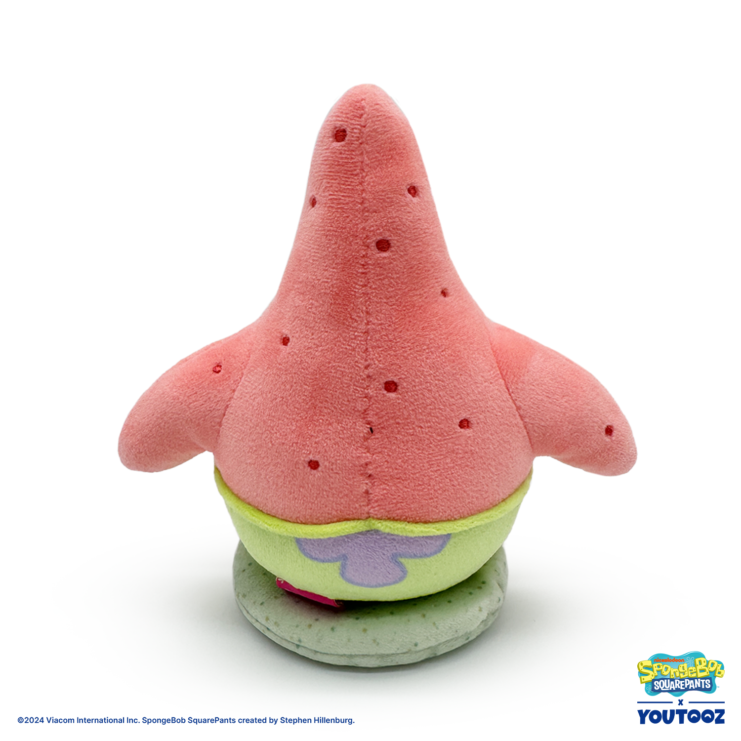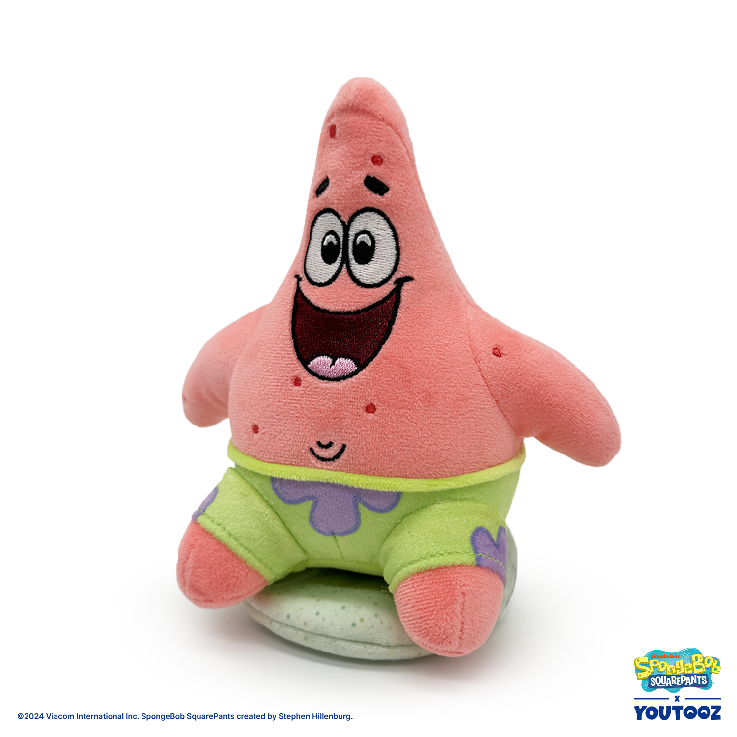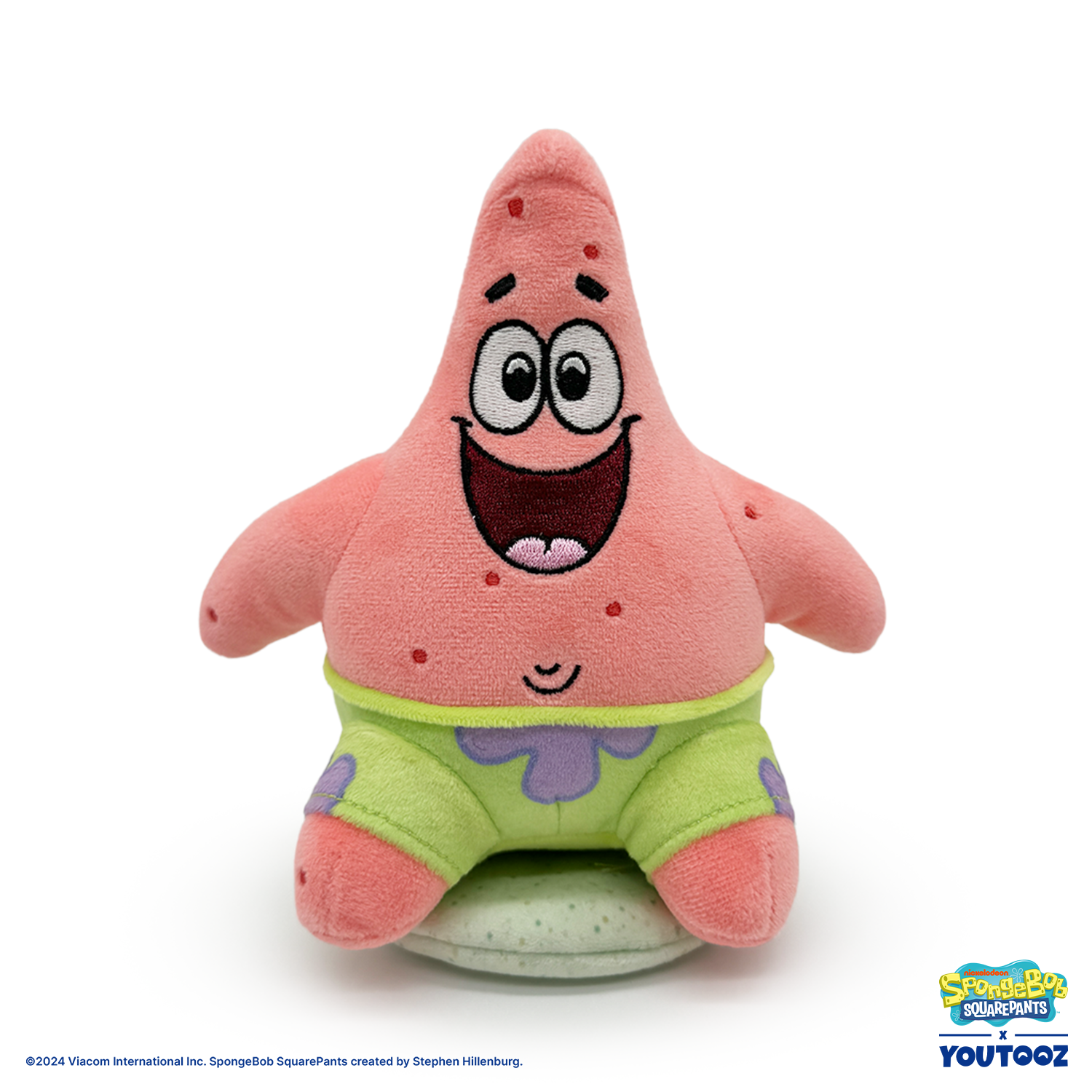 Patrick’s back at Youtooz to be the other angel on your shoulder, because let’s face it, there isn’t an evil bone in him! Sitting at 5.5 inches tall with the biggest smile sitting underneath beaming white eyes and raised eyebrows, his chunky arms rest against the sides of his round body as short legs poke out from vibrant green and purple patterned shorts. This plushie is made of the softest minky material, is packed to the seams with the most huggable squishy 100% PP cotton and comes equipped with a magnetic disc to let it perch firmly atop your shoulder as the best accessory and a true testament to your love of the fandom!