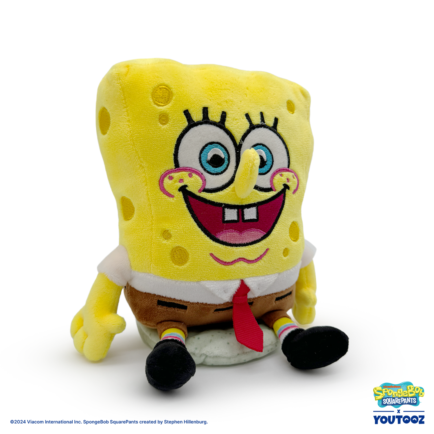 SpongeBob returns to Youtooz to be the perfect angel on your shoulder! Sitting at 5.5 inches tall with an open smile beaming across his face showing off a pair of white buck teeth as a long nose sits between huge eyes, his square yellow sponge of a body sits with its legs dangling forward as he wears a white shirt, brown shorts and bright red tie. This plushie is made of the softest minky material, is packed to the seams with the most huggable squishy 100% PP cotton and comes equipped with a magnetic disc to let it perch firmly atop your shoulder as the best accessory and a true testament to your love of the fandom!