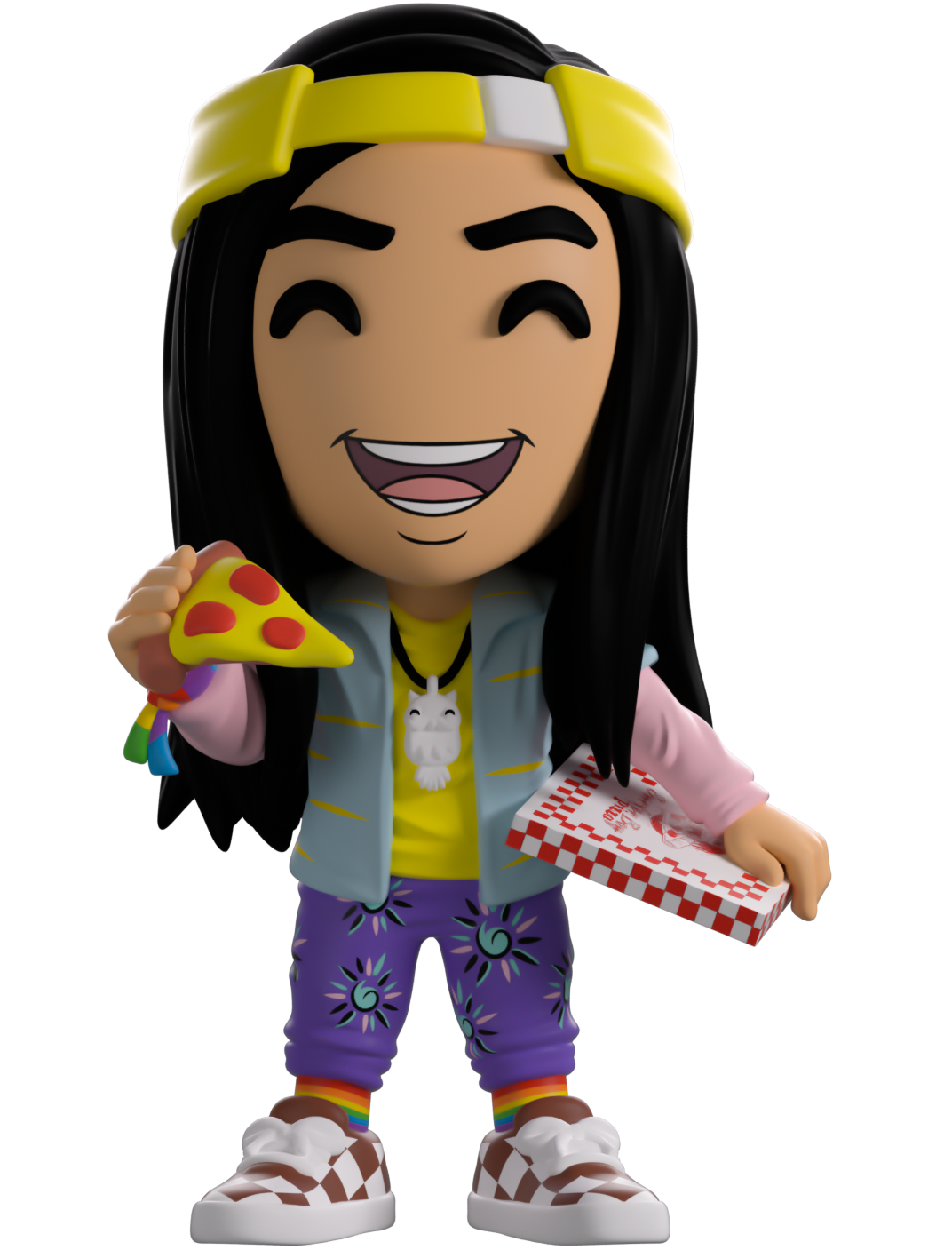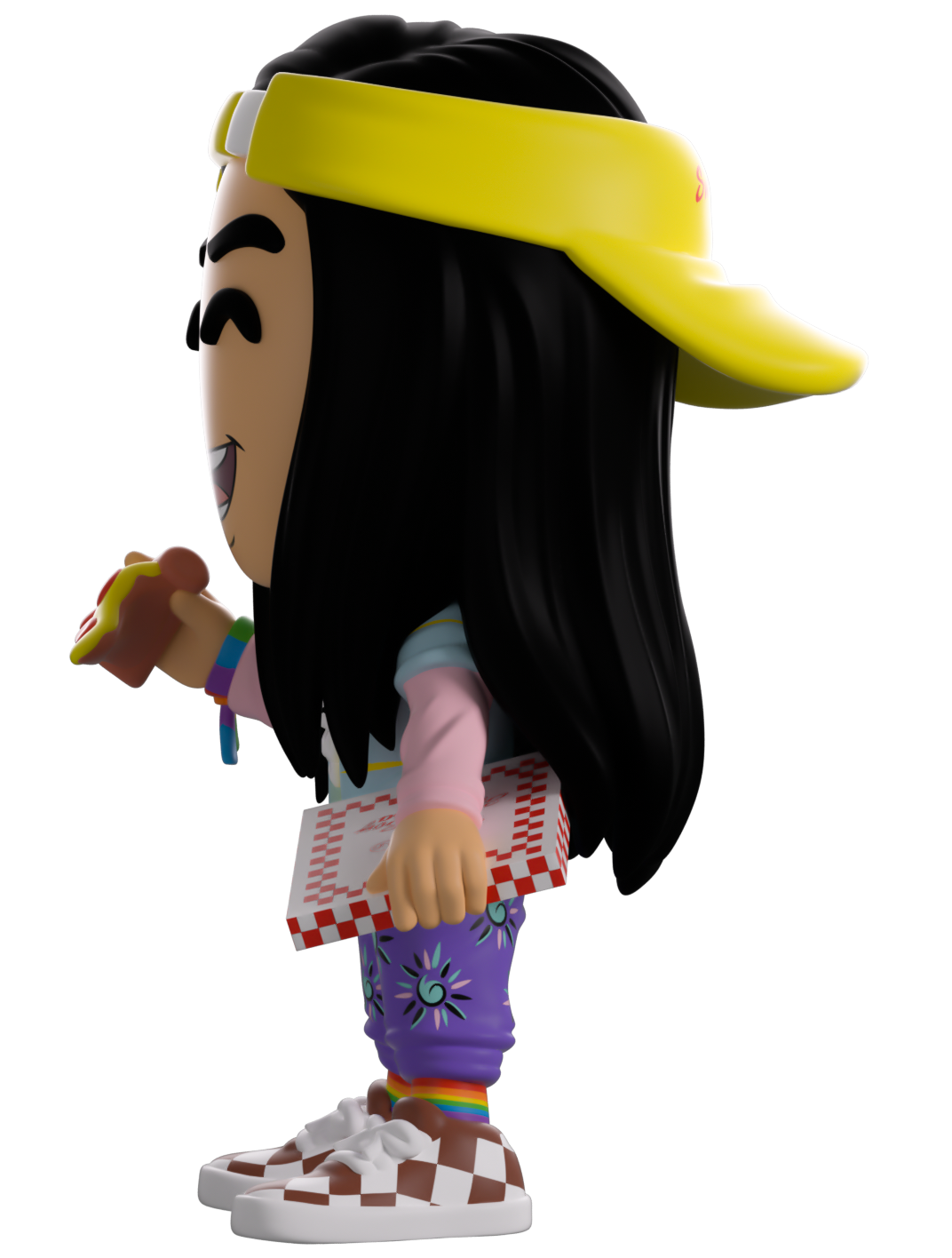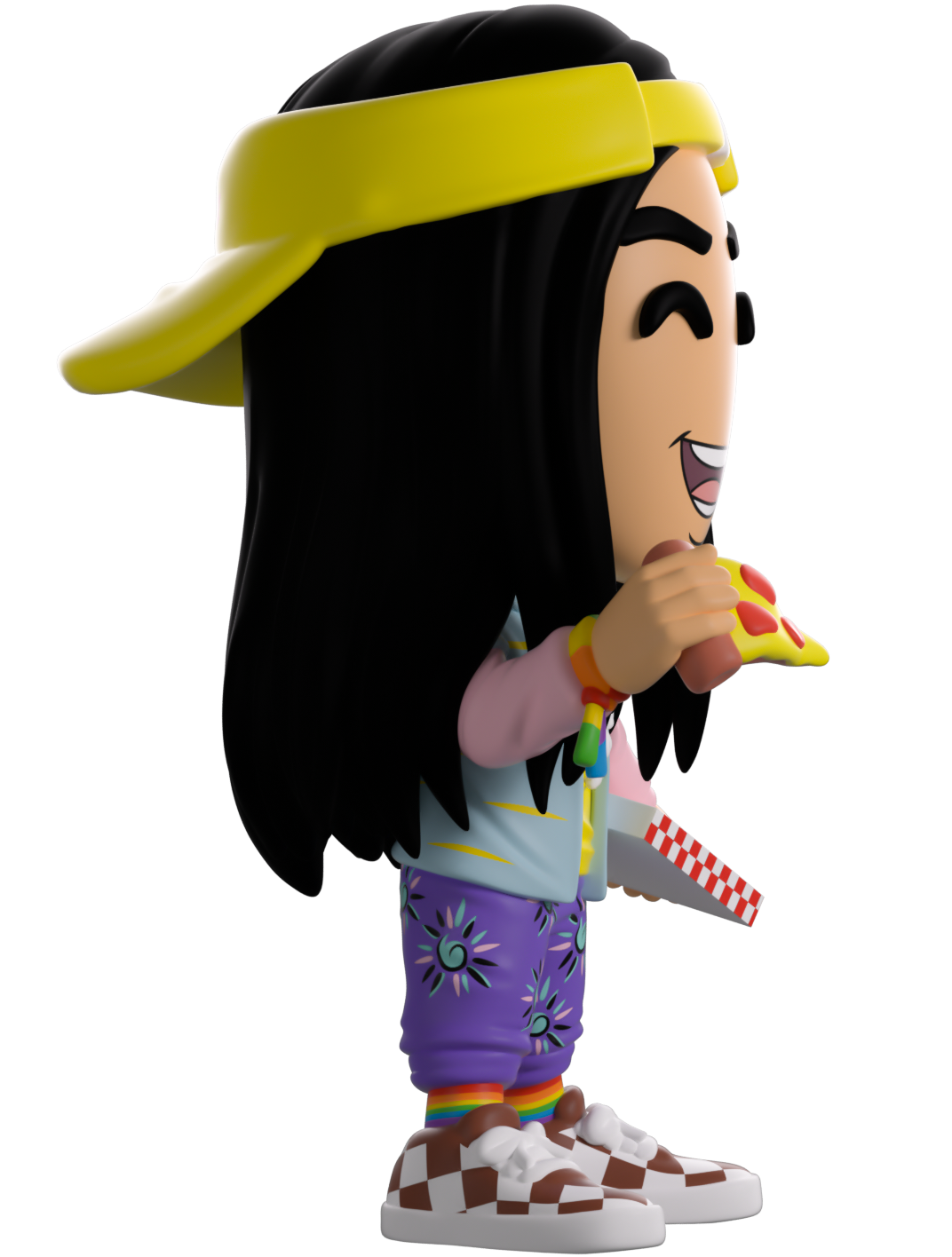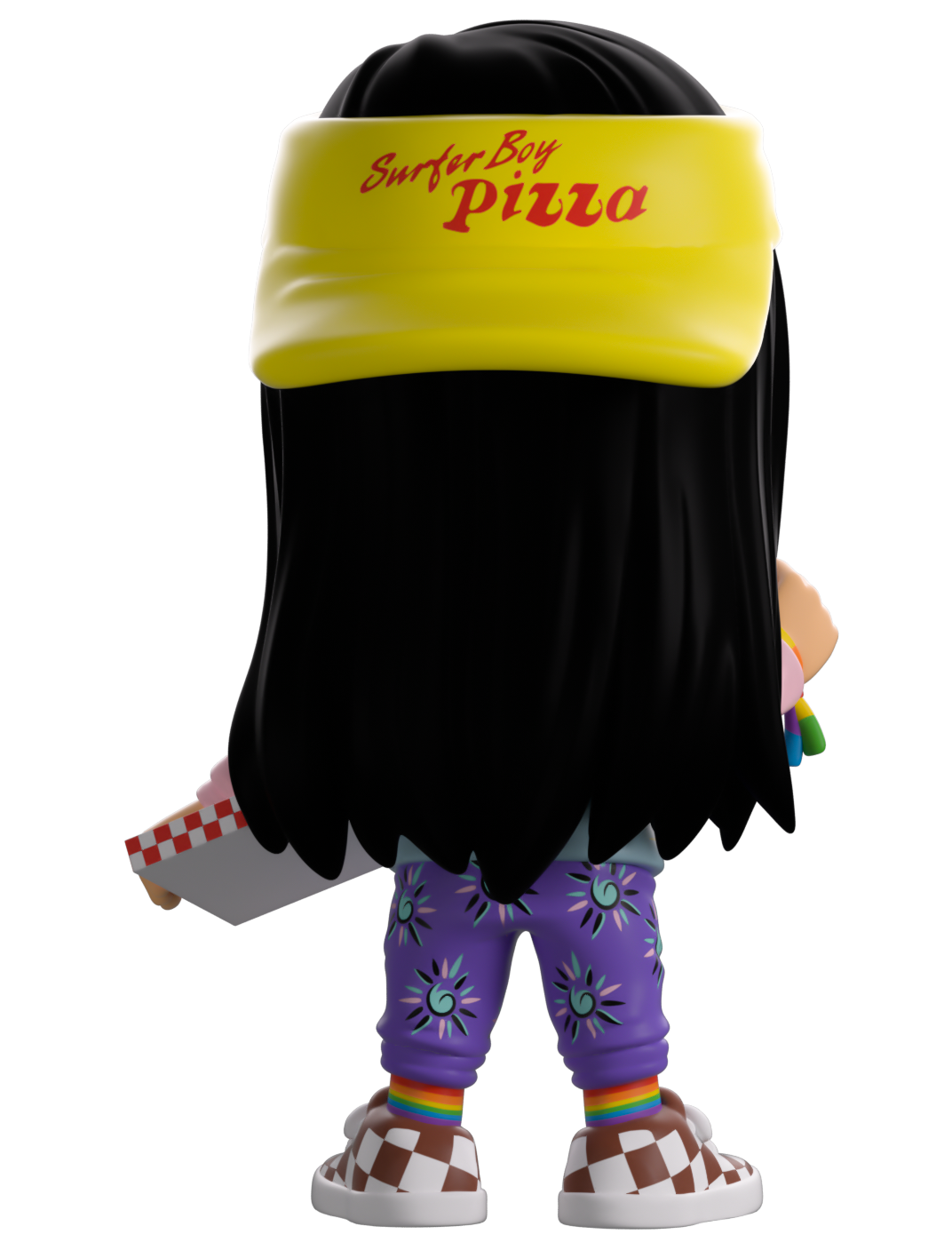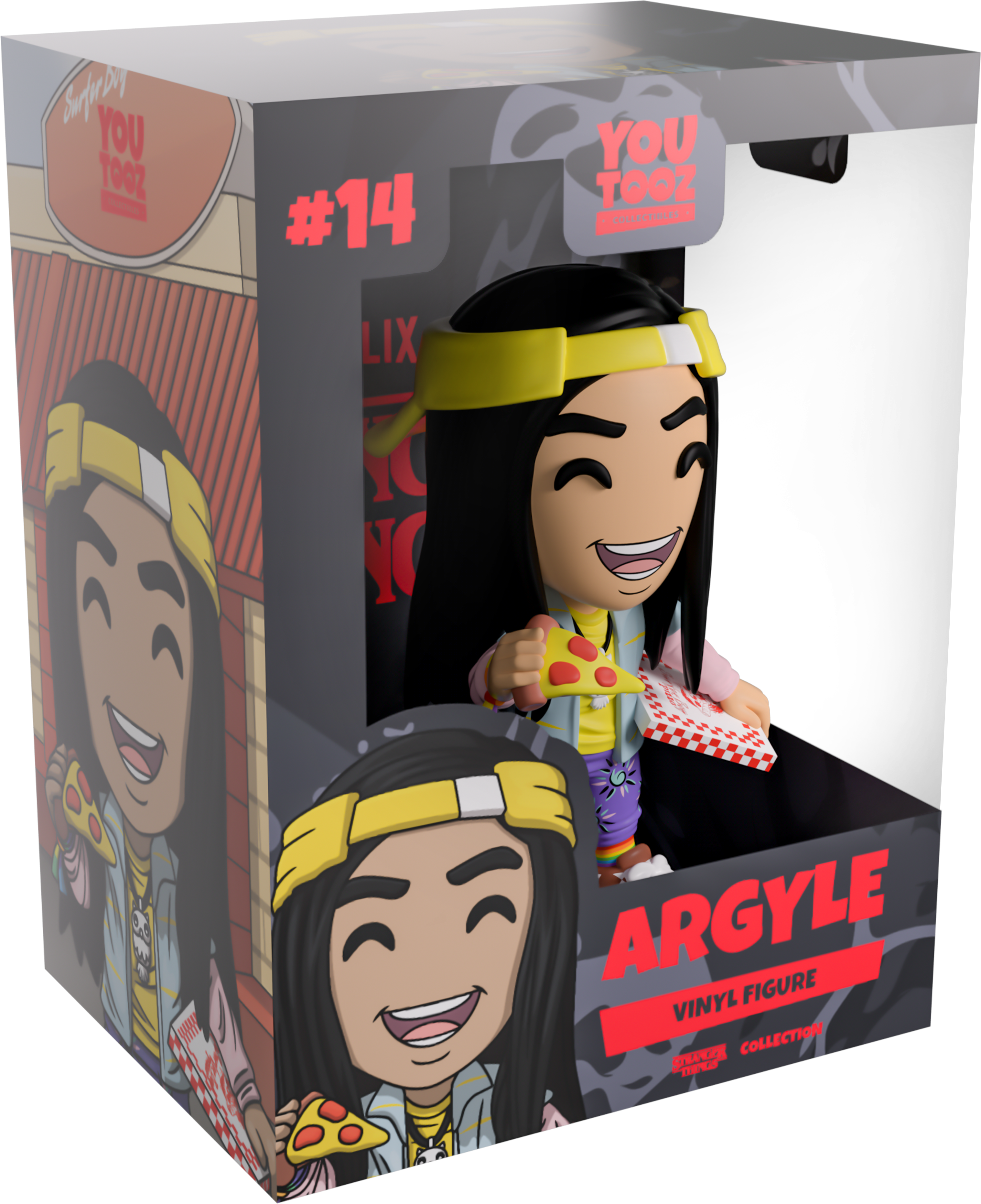 Did someone order a pizza? Well Argyle’s here to serve up the freshest za along with his Youtooz debut! With a huge smile stretching across his face as he stands at 4.6 inches tall with a slice of pizza raised in his right hand as the red checked box is resting against his hip, a bright yellow ‘Surfer Boy’ visor sits backwards on his head over his long waist length black hair. Wearing an outfit as bright as his personality, he’s dressed in a blue shirt over his pink and yellow long sleeve, purple patterned pants, rainbow socks and checked sneakers. The exterior of his packaging sees him hanging out the window of the Surfer Boy Pizza delivery van, while the interior is black sticky goop running in tendrils over a black background. The protective sleeve recreates the Upside Down with a dilapidated house and spindeling trees as his figure can be seen through the large clear display window at its front. This collectible ships in a matte, embossed, protective outer sleeve and a custom sized plastic protector for maximum protection during shipping.