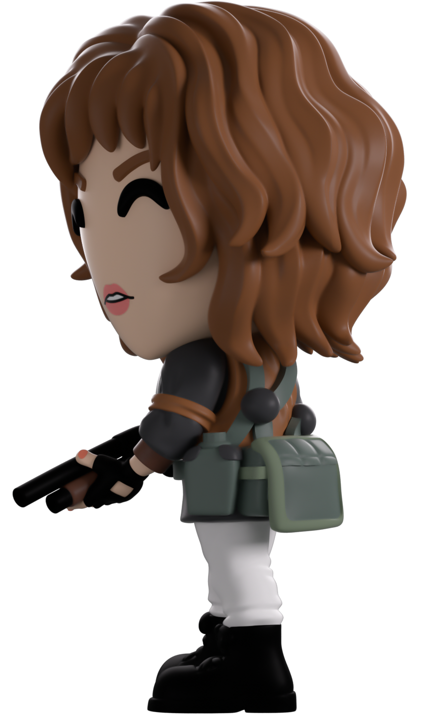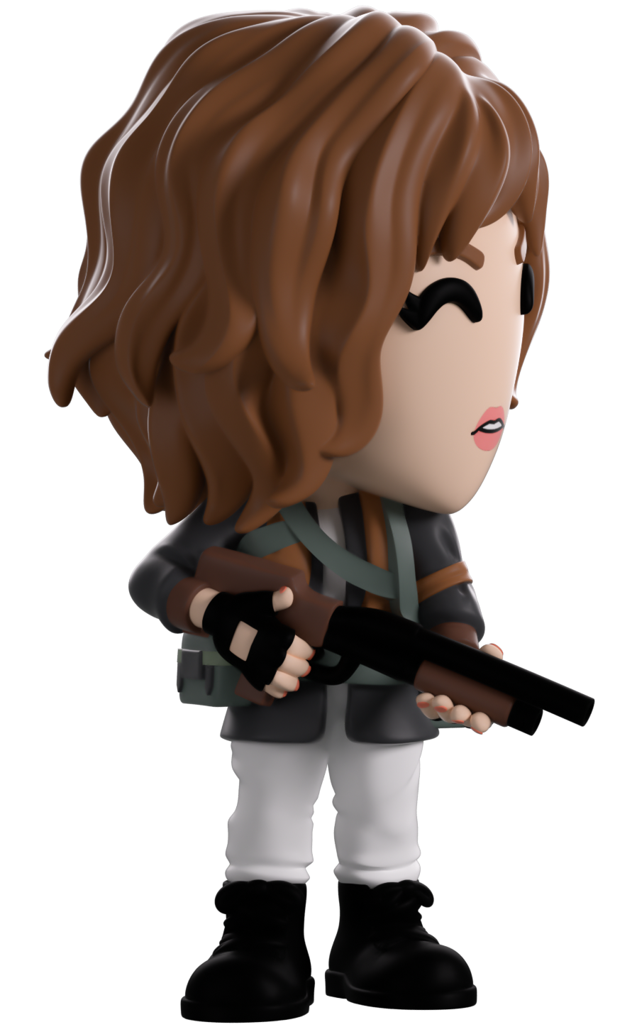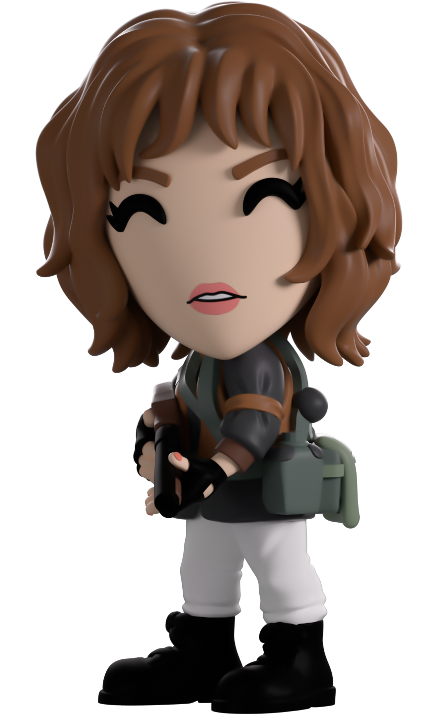 Nancy’s blasted her way into Youtooz for her vinyl debut! Standing at 4.6 inches tall with locks of shaggy brown hair framing her face as her mouth creeps open to show off a look of concern, she holds a black and brown shotgun tightly in gloved hands at the ready for whatever may jump around the corner. Dressed prepared for a full scale battle, she wears a brown vest over her green jacket along with a white shirt and pants with black boots as pouches are strapped to her waist. The exterior of her packaging sees her standing in the doorway of a burning wooden building, while the interior is black sticky goop running in tendrils over a black background. The protective sleeve recreates the Upside Down with a dilapidated house and spindeling trees as her figure can be seen through the large clear display window at its front. This collectible ships in a matte, embossed, protective outer sleeve and a custom sized plastic protector for maximum protection during shipping.