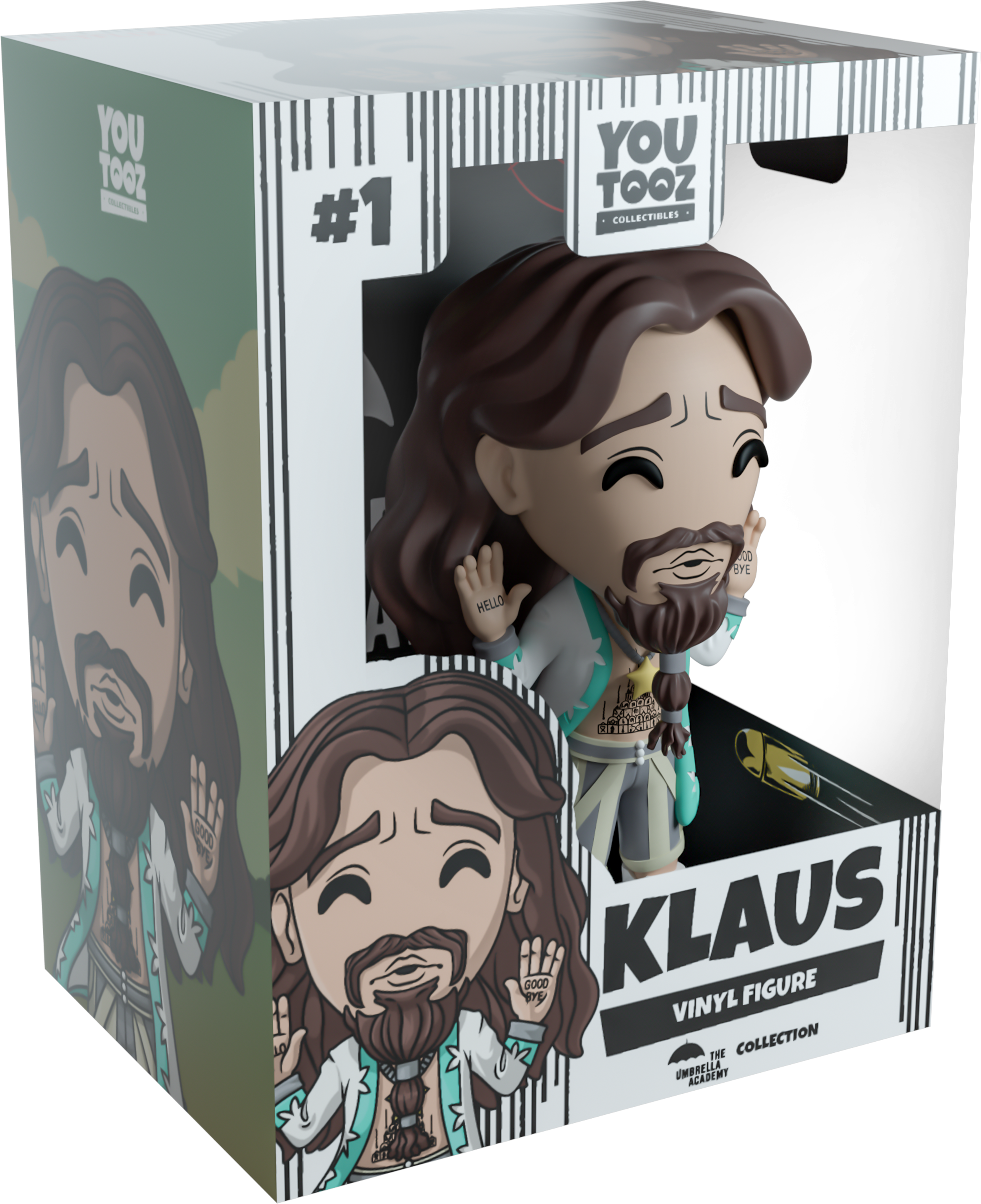 Now, we KNOW it’s not a cult, but when Klaus strolled into Youtooz for his debut, we couldn’t help but join him! Standing at 4.4 inches tall with his hands raised showing off the ‘Hello’ and ‘Good Bye’ tattoos on his palms, his face flashes with a look of concern as a thick moustache sits above his mouth and a long goatee hangs down in front of a bare chest and tattooed stomach. With a mane of flowing brown hair that falls down past his shoulders, he wears an open billowing white coat with a pale green trim, striped grey and beige pants and white boots. The exterior of his packaging sees a slightly overwhelmed Klaus being praised by his ‘not a cult’. While the interior of his packaging is a stark black covered in red and white flying bullets, knives, umbrellas and crosshairs which continues onto the protective sleeve where his figure can be seen through the large clear window at the packaging’s front. This collectible ships in a matte, embossed, protective outer sleeve and a custom-sized plastic protector for maximum protection during shipping.