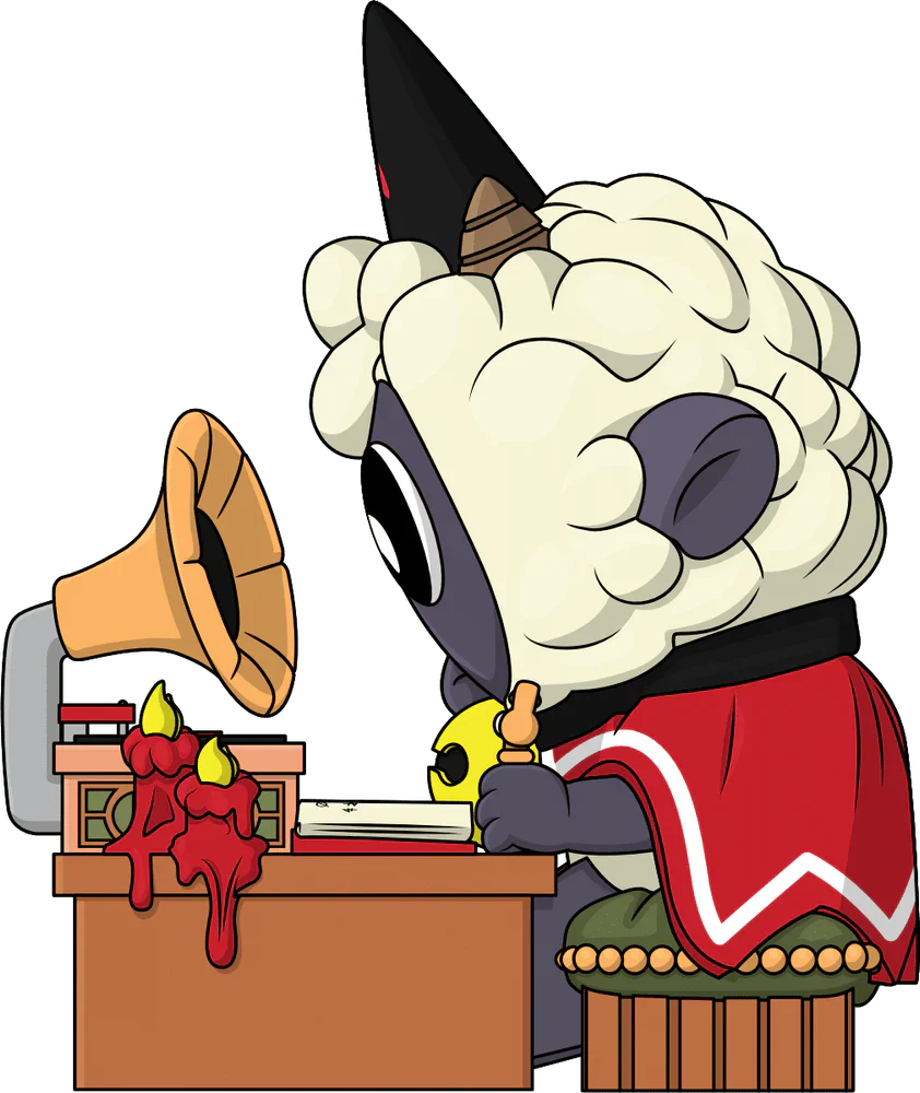 No one sees what goes on behind the sermons, it’s hard work, research and… well maybe a little chilling… Sitting at 3.5 inches tall with their fluffy white head resting on their right hand as they pen down their next sermon into the bright red book that sits on the desk in front of them, a small content smile sits across their face as they soak in the chill beats that emerge from their gramophone. Wearing a black crown between two short horns and a long red cape that falls down to the cushioned stool they’re seated on, a pair of red melting candles light up their desk so they can chill long into the night. The exterior of their packaging sees a close-up of the Lamb's desk with scrawled book pages and melting candles. The interior is a vibrant blood splatter littered with symbols over an off-white background. The protective sleeve continues this off-white, with crosses and chains affixed to the ground and being pulled into the sky as their figure can be seen through the large clear window at the packaging’s front. This collectible was designed in collaboration with @therealracckun and ships in a matte, embossed, protective outer sleeve and a custom-sized plastic protector for maximum protection during shipping.