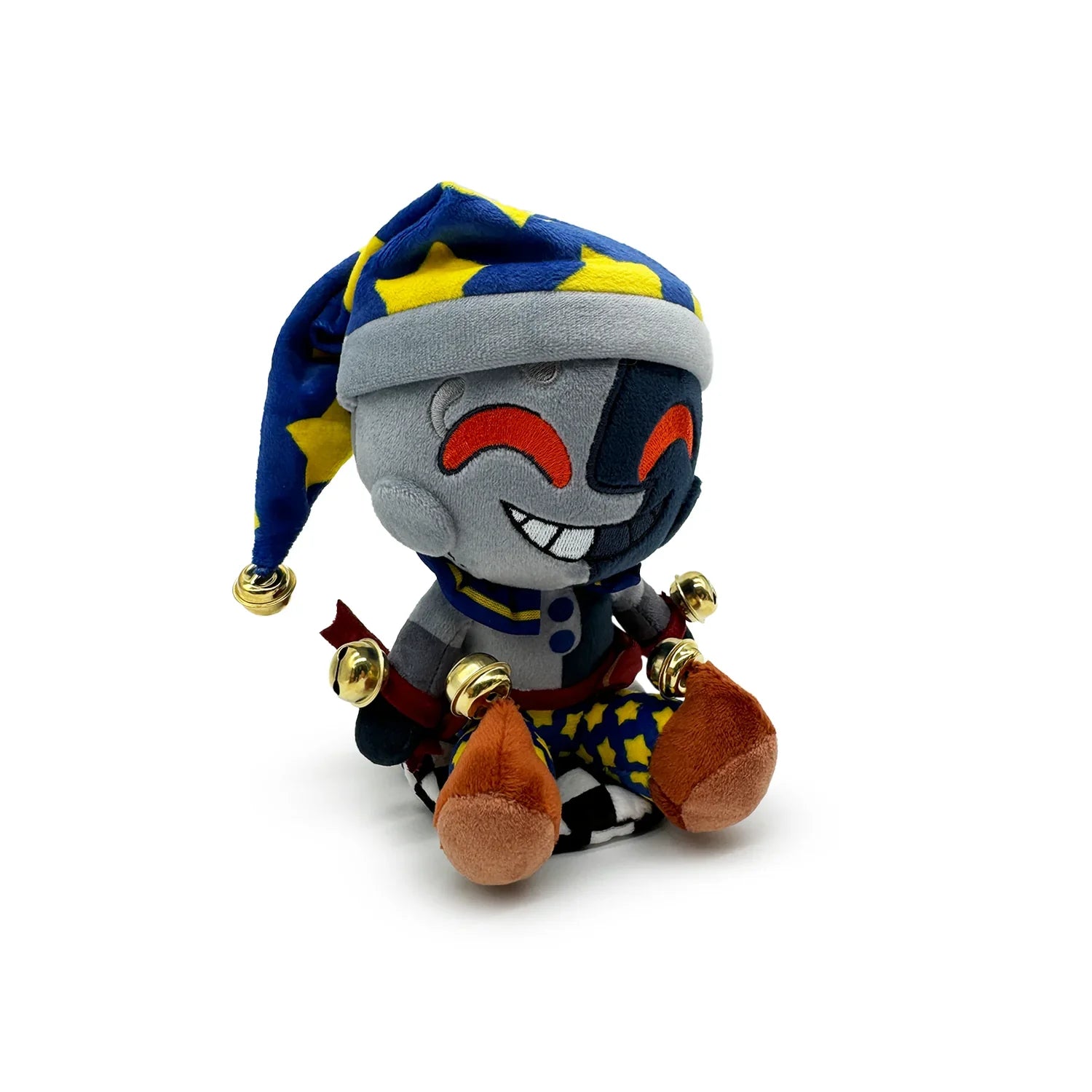 At 6 inches tall and sitting with their short legs kicked forward, a cheeky smile crosses up their two toned grey and blue face as shining red eyes peer out underneath a long slouching star patterned blue hat that’s tipped with a bell. Their frilled blue and yellow collar matches their flared pants, while a brown waist piece matches wrist bands and curled shoes which are adorned with golden bells. This plushie is made of a minky material packed to the seams with the most huggable squishy 100% PP cotton and comes equipped with a magnetic disc to let it perch firmly atop your shoulder as the best accessory and a true testament to your love of the fandom!