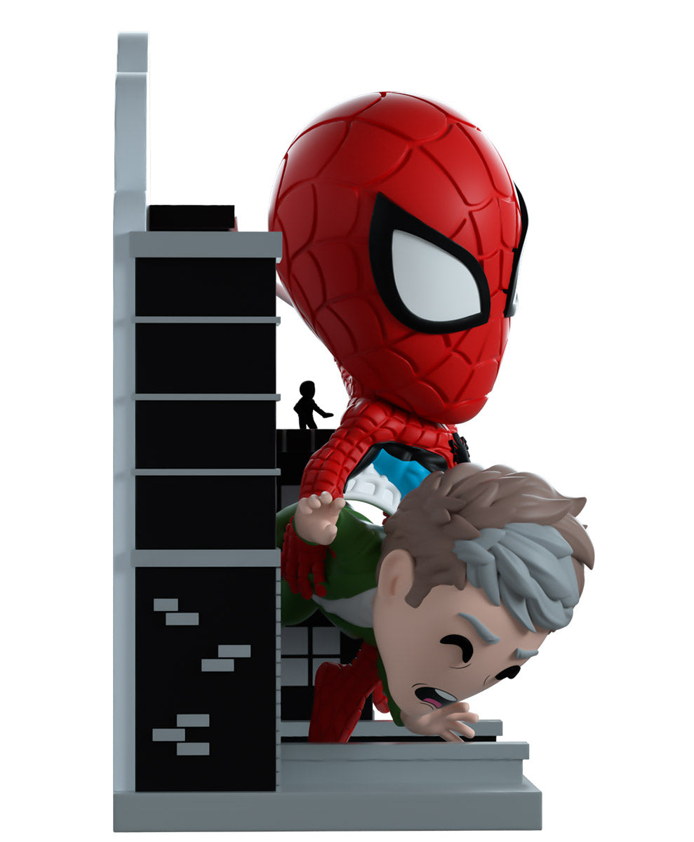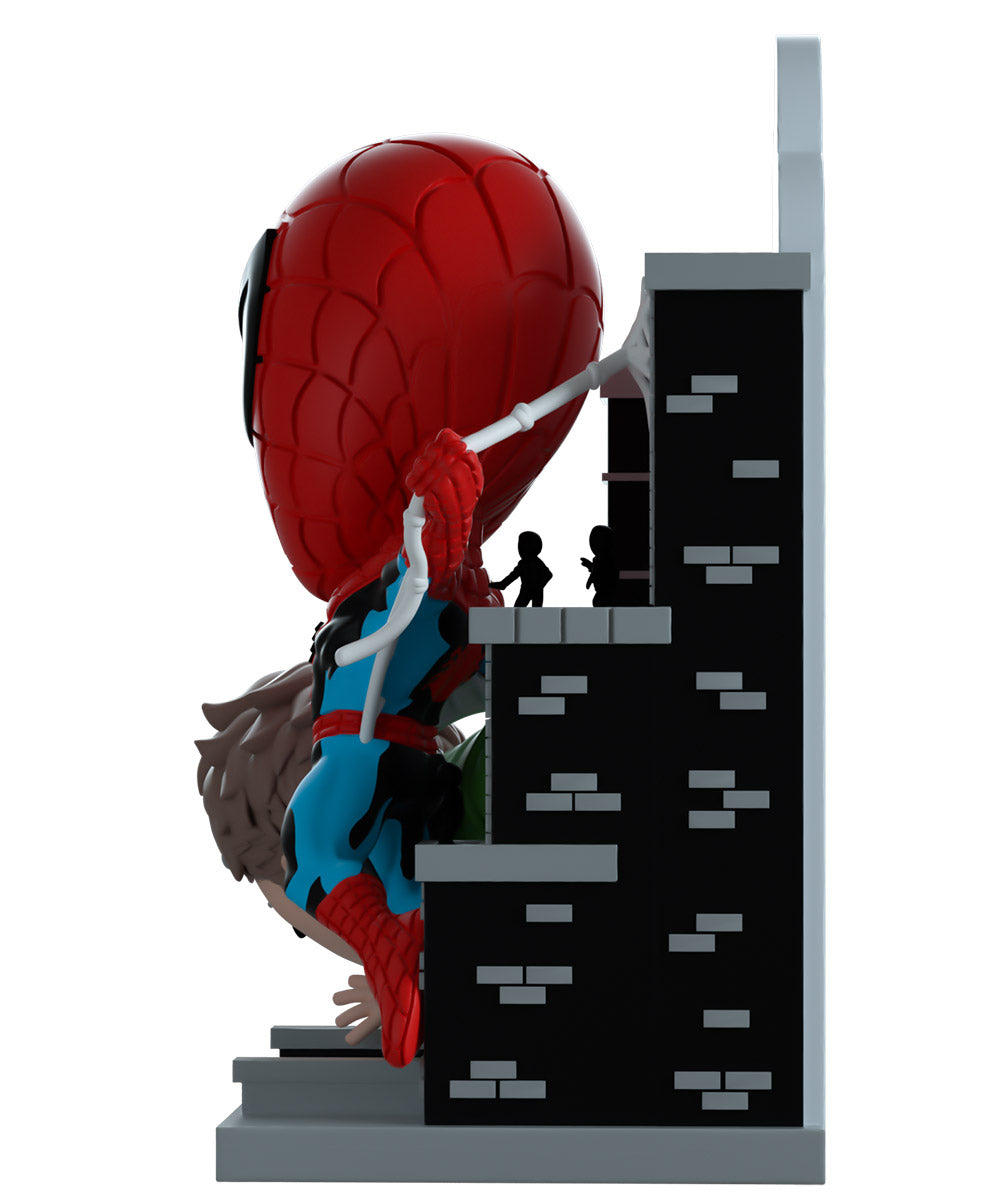 Spider-Man swings in for his amazing debut to Youtooz with a callback to his first appearance! At 5.1 inches tall, he whips around on the web that’s attached to the tall grey buildings in the background as small shadowy figures look on, his large bright white eyes are enclosed with a black rim and sit over the deep red of his mask. With a black spider symbol on his chest and blue under-arms and legs, under his arm he holds a panicking man whose arms flail out in panic. The exterior of his packaging shows Spider-Man swinging through the grey skies of New York, while the interior is covered in light grey panels of Marvel comics. The protective sleeve looks up into the grey sky over dark brick buildings as his figure can be seen through the large clear window at its front. This collectible ships in a matte, embossed, protective outer sleeve and a custom-sized plastic protector for maximum protection during shipping.