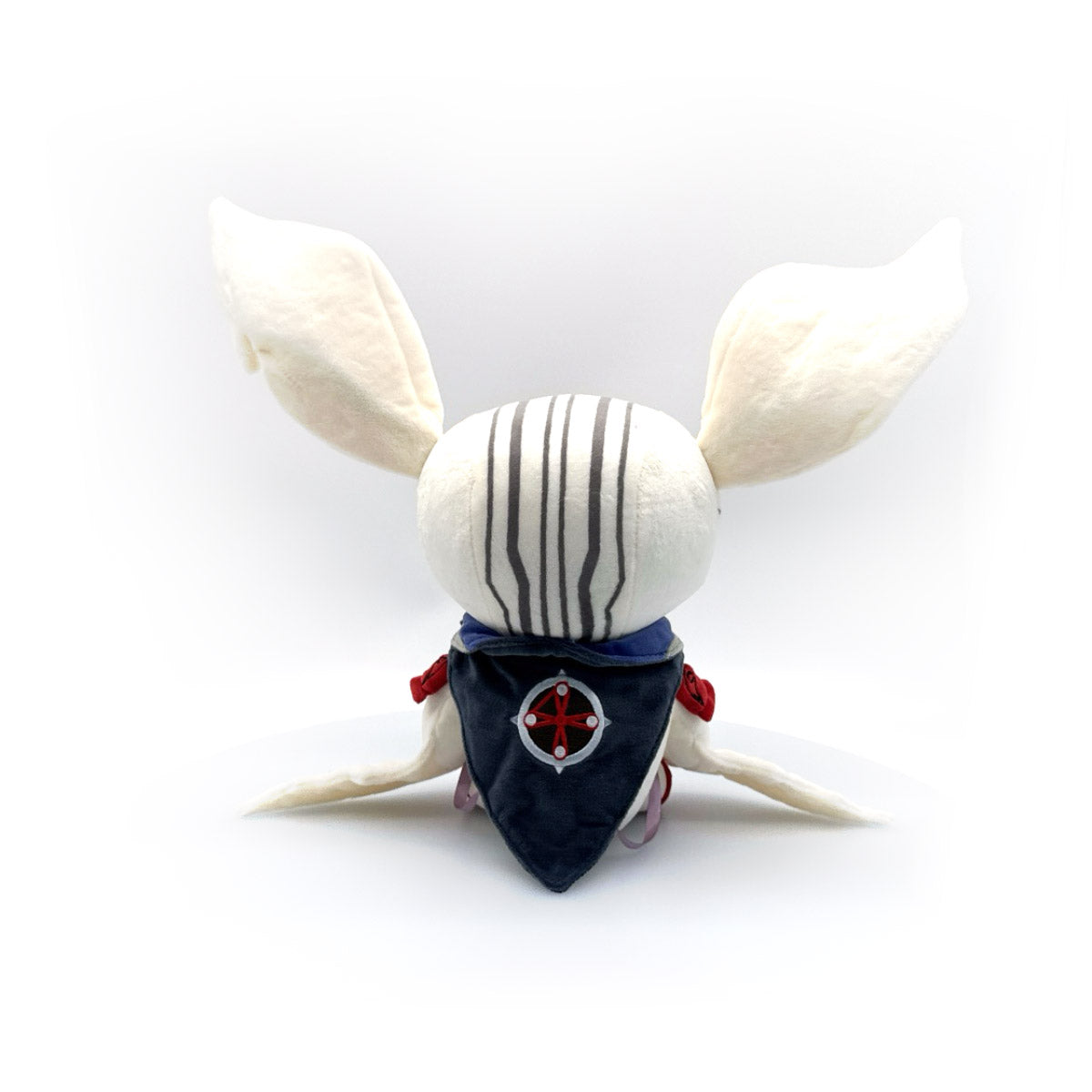 100,000 Reeves? For this cute lil’ guy?! You’re joking right? There’s absolutely no way… unless… Sitting cross-legged at 9 inches tall with huge, deep red eyes and a small smile under his pink nose, dark markings running over his pale cheeks and head, as a pair of enormous ears with pink insides reach out from either side. Wearing a white scarf around his neck that pokes through the wide collar of his pointed navy top, dragon sigils mark each breast as the long wings on his arms stretch out to either side. This plush is packed to the seams with 100% PP cotton and is made of the softest minky material, absolutely perfect for cuddling or being the perfect thief with!