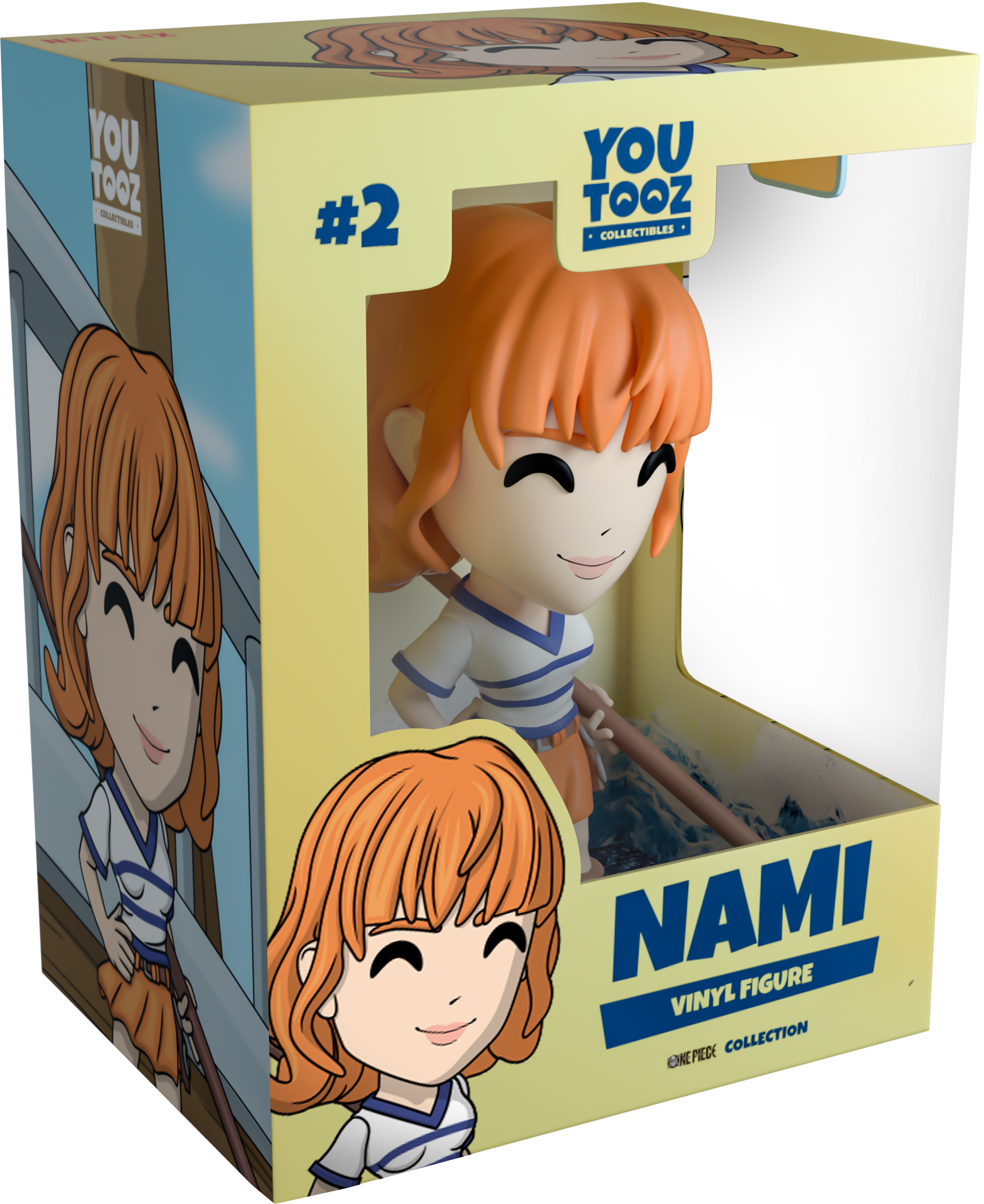 It didn’t matter how rough the seas were, Nami steered her way directly to Youtooz for her debut! With a vibrant bob of orange hair curling down to her shoulders, her blunt fringe sits above a confident smiling face as she stands at 4.4 inches tall. With one hand placed on her hip, the other holds onto a long brown staff that extends behind her as she wears a blue and white v-neck t-shirt, flowing orange skirt and tall brown boots. The exterior of her packaging is that hard wooden deck of the Going Merry with a doorway into the living quarters. While the interior sees a vibrant blue crashing wave sending white sea foam skywards in front of beautiful pale yellow background, this design then flows onto the protective sleeve where her figure can be seen through the large clear display window at its front. This collectible ships in a matte, embossed, protective outer sleeve and a custom-sized plastic protector for maximum protection during shipping.