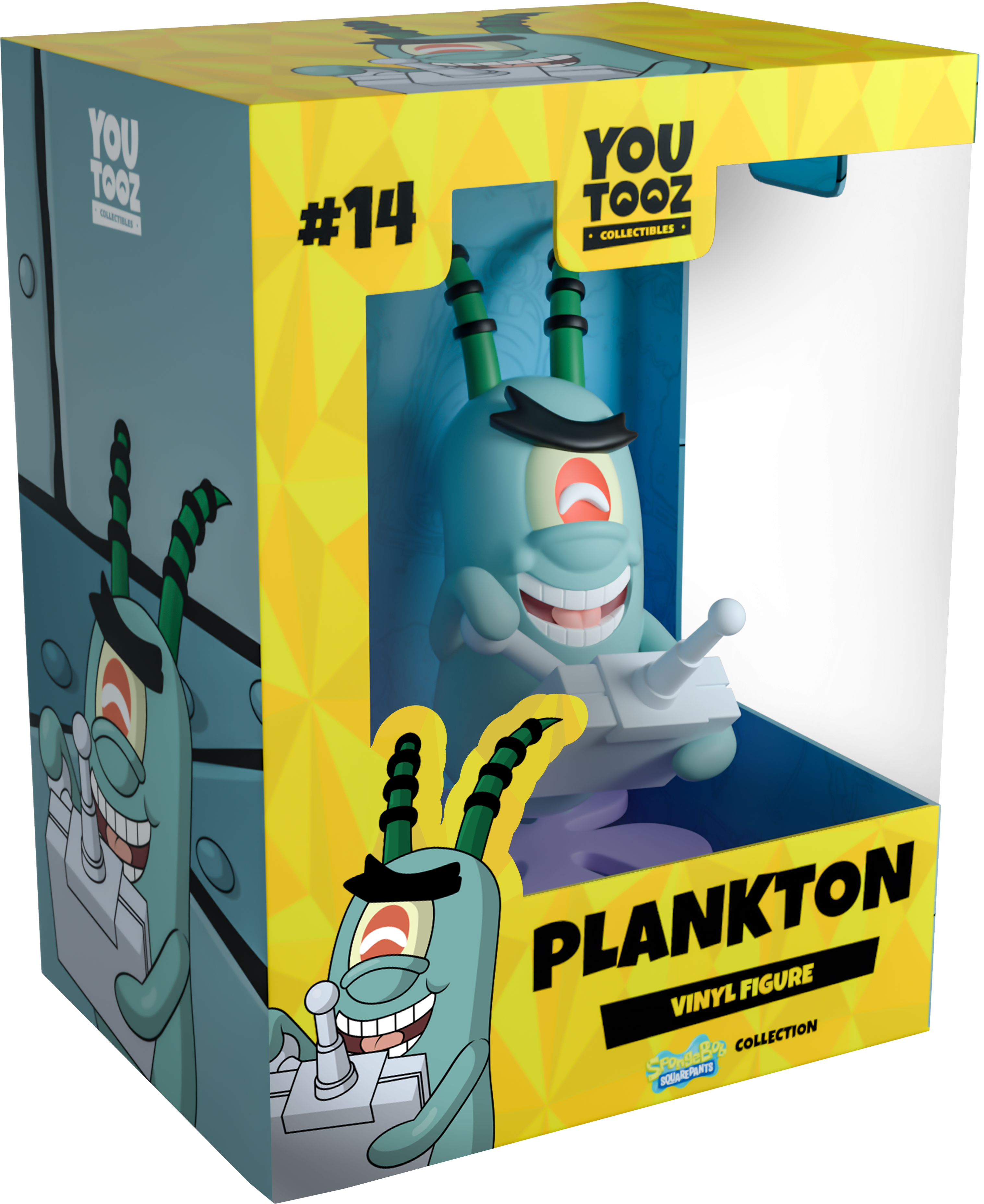 Plankton is done with the Krusty Krab and has set his evil sights on Youtooz! Making his debut at 4.4 inches tall, this fearsome genius is posed with both hands gripping an intricate grey remote control while his mouth opens into a huge smile revealing his shining teeth. His thick black unibrow furrows over his large singular squinting orange eye, as his green and black antennae sprout from the top of his turquoise bean shaped bod. The exterior of his packaging shows Plankton with his greatest creation Robot SpongeBob. While the interior is an ocean blue gradient collaged with illustrations of SpongeBob. The protective sleeve is printed with SpongeBob’s bright yellow triangular pattern. This collectible ships in a matte, embossed, protective outer sleeve and a custom sized plastic protector for maximum protection during shipping.