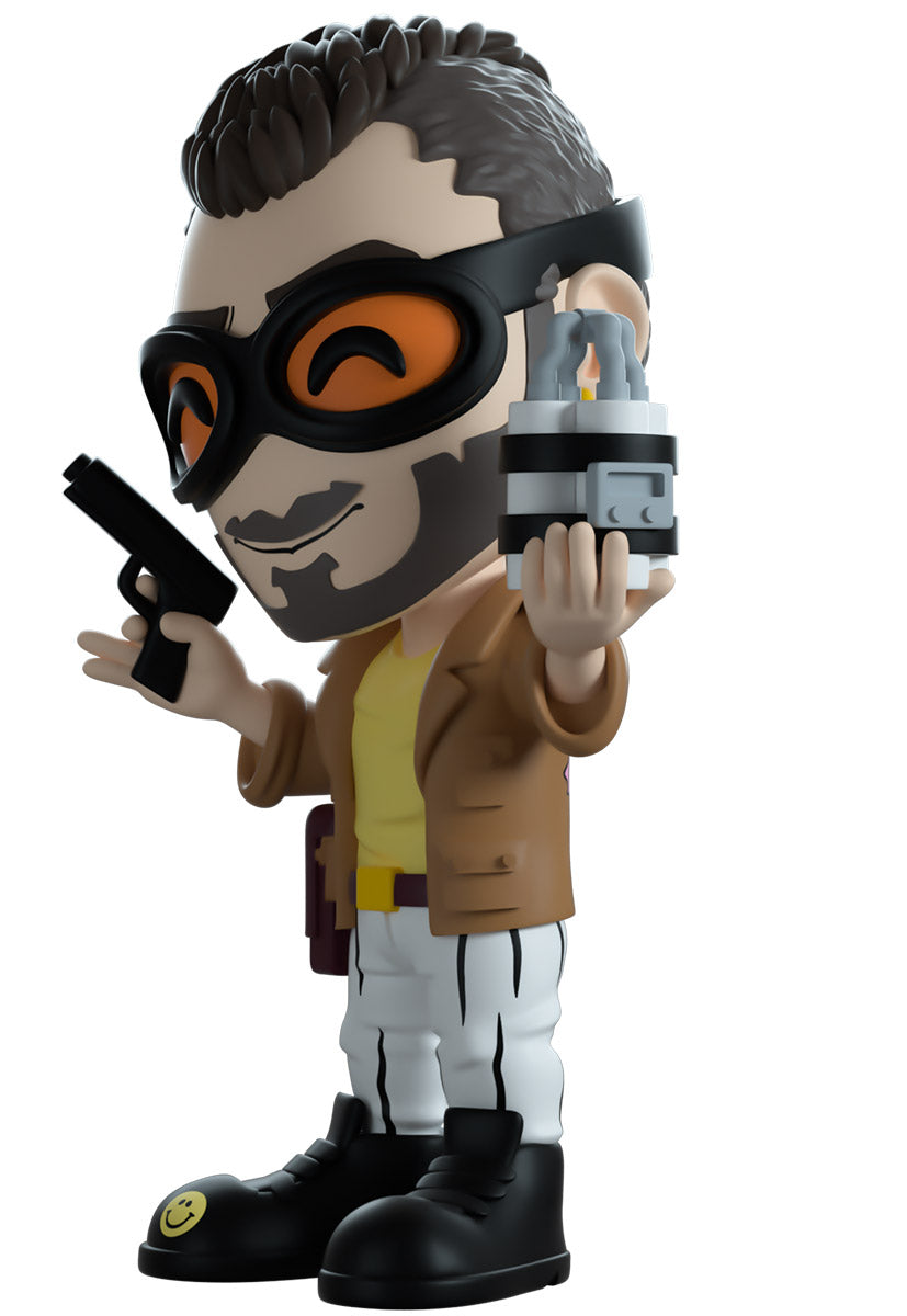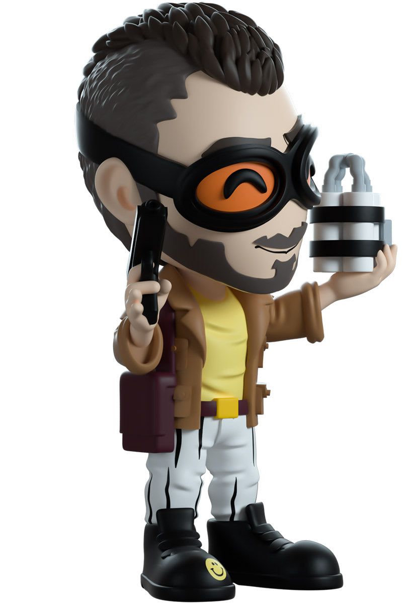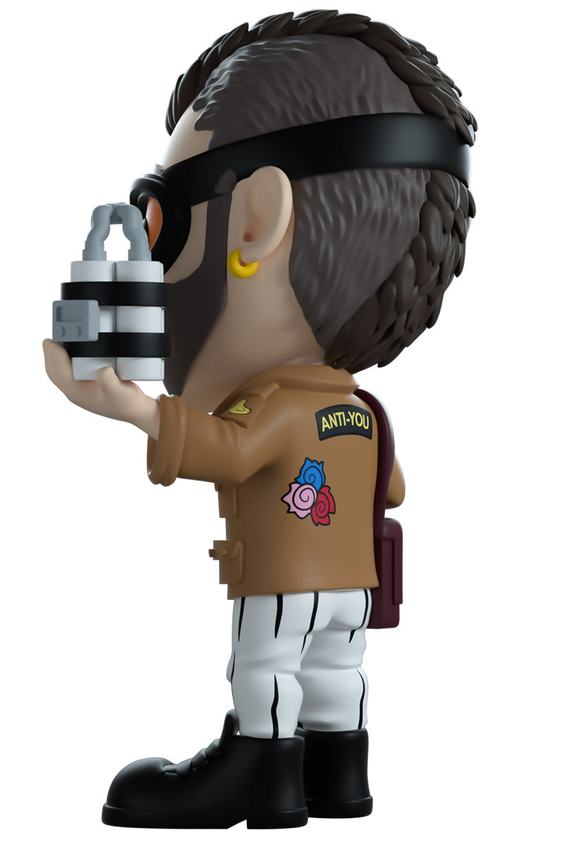 Mon ami, Frenchie is here! At Youtooz! What an absolute delight! Standing at 4.7 inches tall with a cheerful smile stretching through his light unconnected beard and wearing thick black goggles with orange lenses, his short hair runs in a mohawk down the center with fuzzy uncut sides. Holding a pistol playfully in one hand and an intricate white and black bomb in the other, his brown patch covered jacket sits over a yellow t-shirt as he wears white pants and sturdy black boots that have a small yellow smiley face on the toe. The exterior of his packaging sees Frenchie working on a new explosive concoction behind a chemistry stand. The interior surrounds him in a graffiti scrawled white brick wall that continues onto the protective sleeve with blood stains, as his figure can be seen through the large clear window at the packaging’s front. This collectible ships in a matte, embossed, protective outer sleeve and a custom sized plastic protector for maximum protection during shipping.